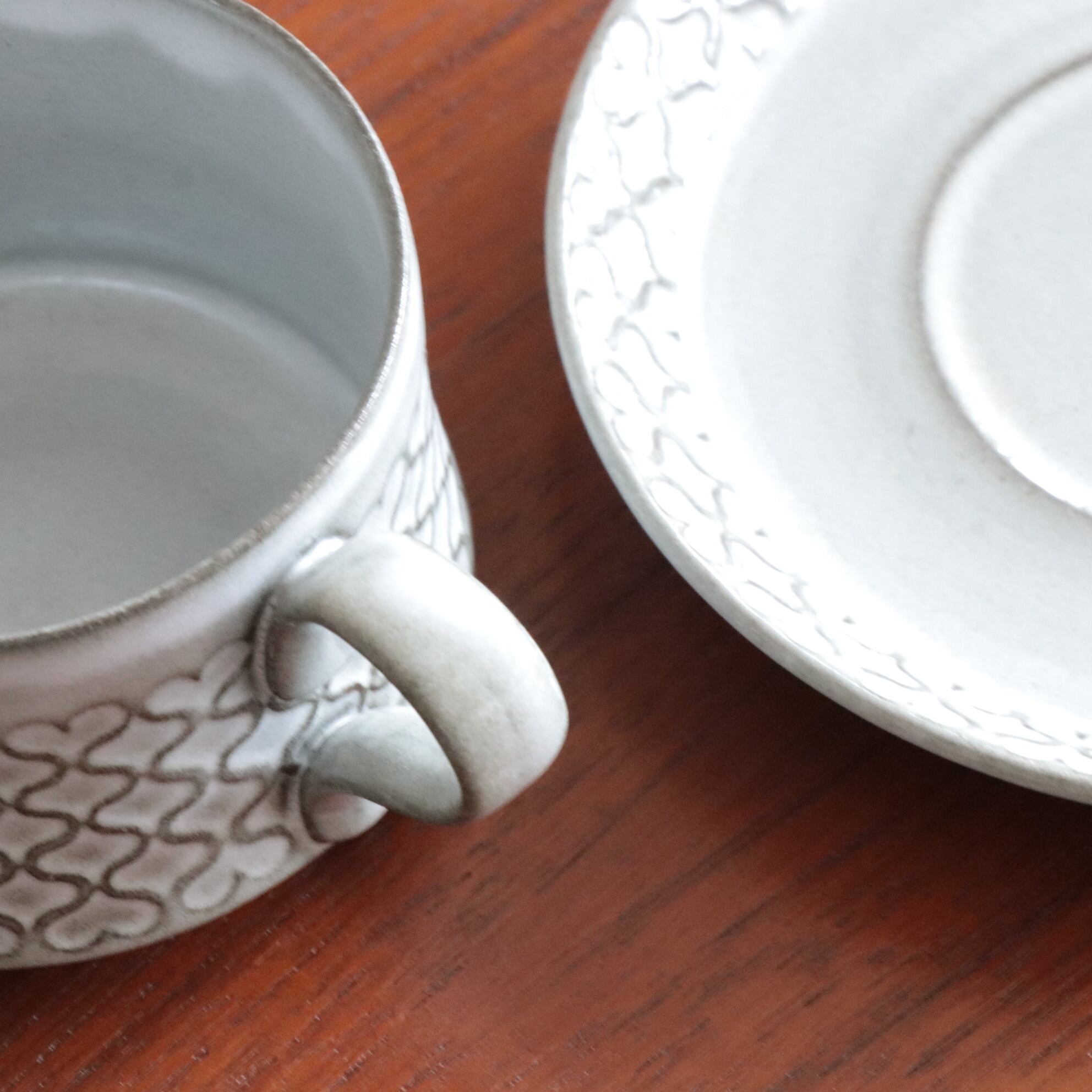 "コーディアル"は"真心"を意味する言葉で、名前のとおりハートの模様がデザインされています。 この意匠はベースの粘土が濃い色の土を用いることで、白い釉薬との差によりはっきりと浮き彫りされるようです。グレーを基本色に、また廃盤前の数年間にはパレットシリーズという名称でいくつかの特別な色で製作されています。